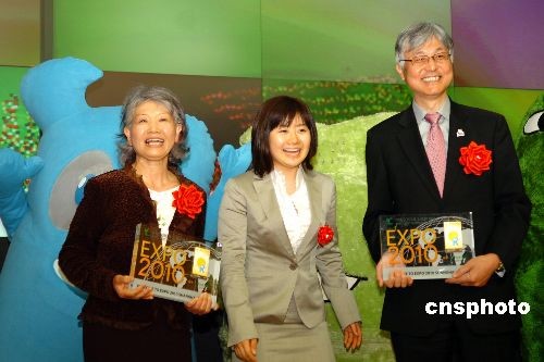 4月11日下午,上海世博組委會在東京舉行“魅力上海,精彩世博——2009日本上海世博推薦周”開幕式。上海市常務副市長楊雄和上海世博會日本推廣形象大使福原愛共同向“超級世博迷”山田外美代及日本觀光廳長官本保芳明贈送了第一張世博門票。日本家庭主婦山田外美代在2005年愛知世博會期間創(chuàng)下了每天入場、總?cè)雸鰯?shù)達二百四十三次的紀錄,被日本媒體授予“世博全勤獎”。圖為福原愛(中)與山田外美代(左)、本保芳明(右)在開幕式上。中新社發(fā) 朱沿華 攝