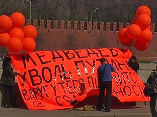 據俄羅斯新聞網報道,俄羅斯反對黨“團結運動”組織成員4月28日在克里姆林宮前舉行了聲勢浩大的反政府游行活動。期間,3名“團結運動”的積極分子在克里姆林宮附近的河岸邊懸掛紅色的巨型橫幅,上面印有:“梅德維杰夫,辭去普京總理職務!弊謽,橫幅兩邊系有紅色的氣球,橫幅下部印有“團結運動”組織的徽標。