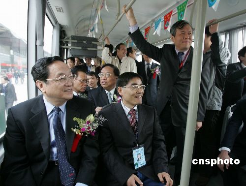 十一月六日,中共中央政治局委員、上海市委書記俞正聲(左)視察“2007中國國際工業(yè)博覽會(huì)”,并乘坐新能源公共汽車。據(jù)悉,這是俞正聲履新上海后,首次出席大型公眾活動(dòng)。中新社發(fā) 潘索菲 攝