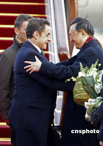 十一月二十五日,法國總統(tǒng)薩科齊乘專機(jī)抵達(dá)北京首都國際機(jī)場,中國外交部部長楊潔篪到機(jī)場迎接。中新社發(fā) 盛佳鵬 攝