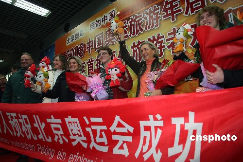 1月1日,首批境外游客抵達北京首都機場,與此同時,2008中國奧運旅游年活動宣布啟動。中新社發(fā) 杜洋 攝
