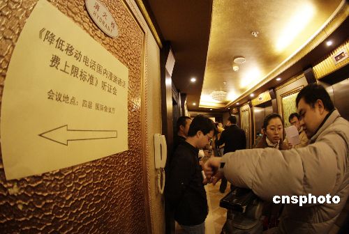 1月22日,備受中國公眾矚目的中國手機(jī)漫游費(fèi)聽證會(huì)在北京舉行。根據(jù)中國信息產(chǎn)業(yè)部去年5月進(jìn)行的網(wǎng)上民意調(diào)查,近64%的手機(jī)用戶擁護(hù)將漫游通話話費(fèi)標(biāo)準(zhǔn)降低至本地通話費(fèi)用水平。中新社發(fā) 吳芒子 攝