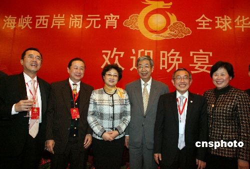 2月18日晚,中國國務院僑務辦公室、福建省人民政府和海峽兩岸關系協(xié)會在福州市舉辦晚宴,熱烈歡迎來閩參加“海峽西岸鬧元宵 全球華人盼團圓”活動的海外華僑華人、港澳同胞和臺灣同胞代表。全國人大常委會副委員長許嘉璐,國務院僑務辦公室主任李海峰,福建省人大常委會副主任王美香,福建省人民政府副省長洪捷序,福建省政協(xié)副主席張帆等出席了歡迎晚宴。圖為全國人大常委會副委員長許嘉璐、國務院僑務辦公室主任李海峰與嘉賓合影祝酒。中新社發(fā) 張勤 攝