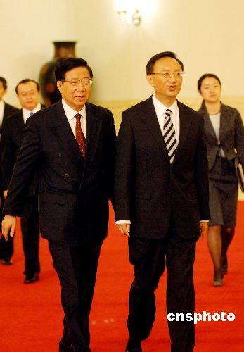 圖為楊潔篪(前右)、姜恩柱(前左)等步入記者會現(xiàn)場。