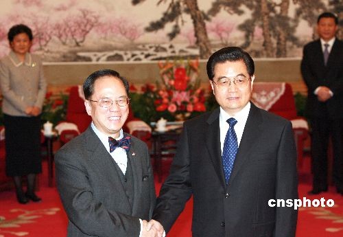 3月18日,中國國家主席胡錦濤在北京中南海會見了來京列席十一屆全國人民代表大會一次會議的香港特別行政區(qū)行政長官曾蔭權。中新社發(fā) 廖文靜 攝