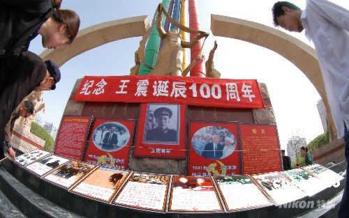 4月11日下午,是王震同志誕辰100周年紀(jì)念日。新疆巴州紅色收藏家陳伯壽在庫(kù)爾勒人民廣場(chǎng)免費(fèi)展出王震圖片和資料。當(dāng)日,新疆各地州舉辦座談會(huì)、展出王震圖片和資料等形式紀(jì)念王震同志誕辰100周年。中新社發(fā) 確·胡熱 攝