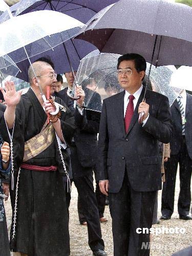 正在日本進(jìn)行國事訪問的中國國家主席胡錦濤,十日冒雨參觀位于奈良的法隆寺。法隆寺是日本佛教圣德宗的總寺廟,寺內(nèi)供奉有百濟(jì)觀音等大量國寶級文物,是日本佛教文化寶庫。中新社發(fā) 齊彬 攝