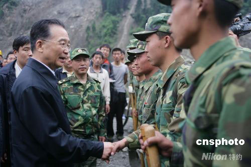 5月14日下午,國務院總理溫家寶在地震災區(qū)看望救災武警官兵。中新社發(fā) 劉震 攝
