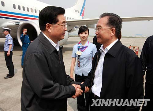 5月16日,中共中央總書記、國家主席、中央軍委主席胡錦濤乘飛機(jī)抵達(dá)四川綿陽,慰問災(zāi)區(qū)干部群眾,看望抗震救災(zāi)一線的部隊(duì)官兵和醫(yī)護(hù)人員。國務(wù)院總理溫家寶到機(jī)場迎接胡錦濤。 新華社記者鞠鵬攝