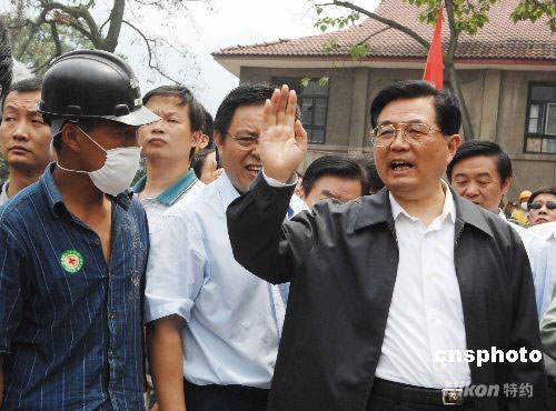 中共中央總書記、國家主席、中央軍委主席胡錦濤五月十六日抵達地震重災區(qū)綿陽北川羌族自治縣查看災情,并慰問參加搶險救災部隊指戰(zhàn)員和受災群眾。中新社發(fā) 陳文 攝