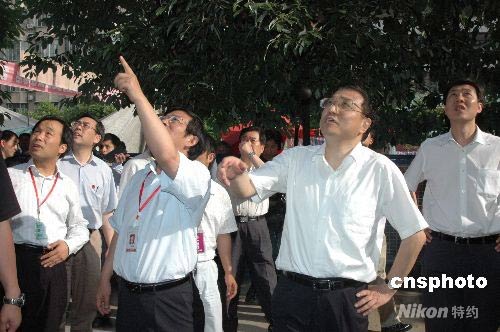5月18日,中共中央政治局常委、國務院副總理、國務院抗震救災總指揮部副總指揮李克強(右)在四川長虹集團董事長趙勇的陪同下,看望住在長虹虹苑劇院里的職工。他關(guān)切地詢問這里是不是危樓。中新社發(fā) 肖龍聯(lián) 攝