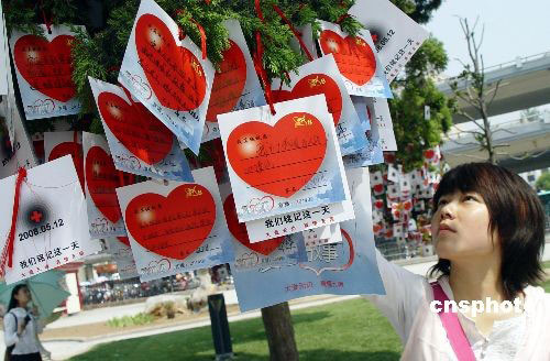 五月二十日,鄭州女孩在整理翻看松柏樹上懸掛的“愛心”牌。五月十九至二十一日是全國哀悼日,鄭州社會各界通過不同方式,悼念“五·一二”汶川大地震中失去生命的同胞,為幸存者祈福,街心公園許多樹梢掛滿“愛心”牌。