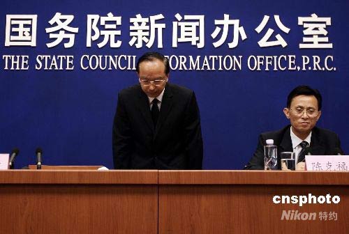 5月23日,在國務(wù)院新聞辦公室就四川汶川地震災(zāi)害和抗震救災(zāi)情況舉行的第十二次發(fā)布會上,四川省副省長李成云鞠躬感謝全國人民的支持。中新社發(fā) 杜洋 攝