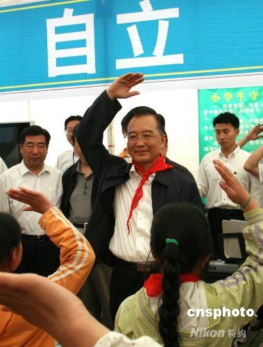 溫家寶和災(zāi)區(qū)帳篷學(xué)校孩子一起敬隊禮