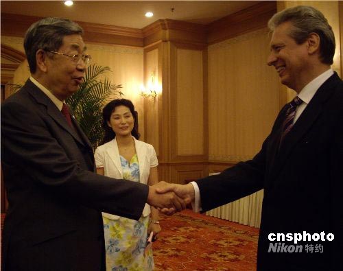7月8日晚,當羅馬尼亞駐華大使伊斯蒂奇瓦亞(右)用一口流利的中文與十屆全國人大常委會副委員長許嘉璐(左)進行著一次關(guān)于全球化背景下語言作用的深刻對話時,漢語無疑搭建了一座溝通中國與世界心靈與思想的橋梁。 包括伊斯蒂奇瓦亞及秘魯、保加利亞、孟加拉、印尼等國的駐華使節(jié),隨55個國家的100多名大學(xué)生漢語愛好者一道來到湖南長沙,這些學(xué)生將參加第七屆“漢語橋”世界大學(xué)生中文比賽。當晚,許嘉璐在長沙會見了駐華使節(jié)一行。中新社發(fā) 傅煜 攝