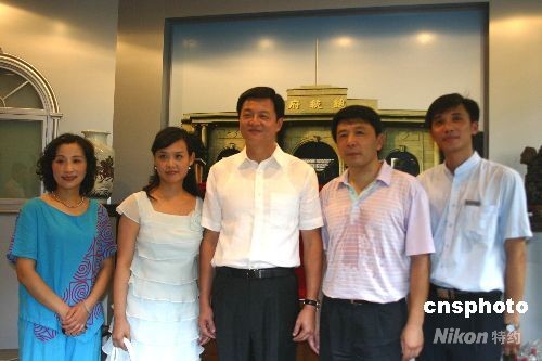 7月26日下午,臺(tái)北縣長(zhǎng)周錫瑋一行參觀南京“總統(tǒng)府”(南京中國(guó)近代史遺址博物館),并在“總統(tǒng)府”巨幅彩照前和館內(nèi)工作人員合影。臺(tái)北縣南京參訪團(tuán)于25日晚間抵達(dá)南京,展開訪問(wèn)。中新社發(fā) 朱曉穎 攝