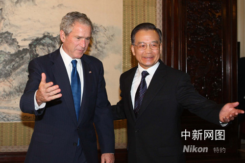 8月10日,中國國務(wù)院總理溫家寶在北京中南海會見美國總統(tǒng)布什一行。中新社記者 廖文靜攝