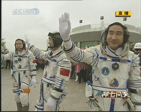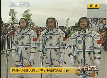 北京時(shí)間二十五日下午五時(shí)三十五分許,“神七”航天員乘組在中國(guó)酒泉衛(wèi)星發(fā)射中心航天公寓“問(wèn)天閣”廣場(chǎng)舉行出征儀式,身穿乳白色艙內(nèi)航天服的“神七”三名航天員翟志剛、劉伯明、景海鵬受命出征太空。