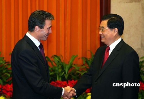 10月22日,中國國家主席胡錦濤在北京人民大會(huì)堂會(huì)見前來出席第七屆亞歐首腦會(huì)議的丹麥?zhǔn)紫嗬鼓律。中新社發(fā) 廖文靜 攝