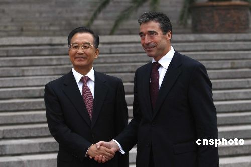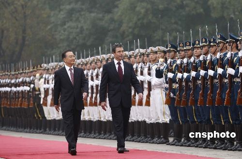 10月22日,中國國務(wù)院總理溫家寶在北京人民大會堂東門外廣場舉行儀式,歡迎丹麥?zhǔn)紫嗬鼓律。中新社發(fā) 盛佳鵬 攝