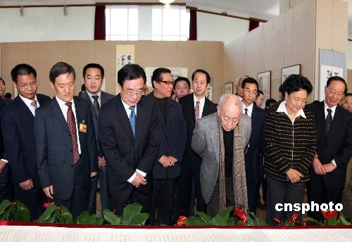 中共中央政治局常委、中央紀委書記賀國強,中共中央政治局委員、國務委員劉延東,中共中央書記處書記、中央紀委副書記何勇和著名畫家黃永玉等在北京軍事博物館一起參觀紀念黨的紀律檢查機關恢復重建30周年書畫展。中新社發(fā) 王保勝 攝