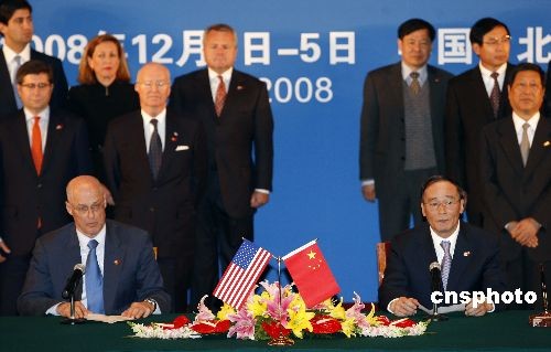 12月4日,在第五次中美戰(zhàn)略經(jīng)濟對話期間,中美能源環(huán)境十年合作框架下綠色合作伙伴計劃的相關(guān)簽字儀式在北京釣魚臺國賓館舉行。中國國務(wù)院副總理王岐山與美國財政部長保爾森分別代表中美兩國政府簽署了《中美能源環(huán)境十年合作框架下的綠色合作伙伴計劃框架》,并出席了相關(guān)合作意向書的簽字儀式。中新社發(fā) 盛佳鵬 攝