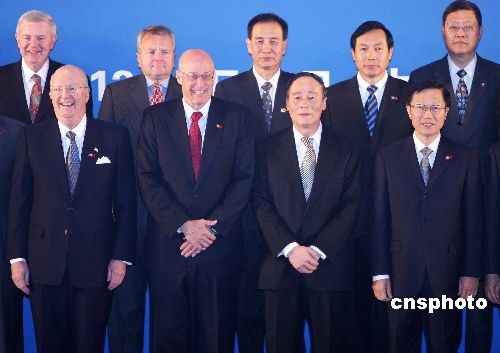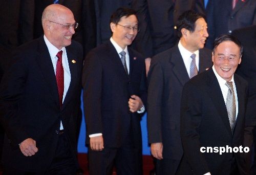 12月5日上午,第五次中美戰(zhàn)略經(jīng)濟(jì)對(duì)話在北京釣魚臺(tái)國(guó)賓館閉幕前,中國(guó)國(guó)務(wù)院副總理王岐山和美國(guó)財(cái)政部部長(zhǎng)保爾森以及雙方與會(huì)人員合影留念。中美戰(zhàn)略經(jīng)濟(jì)對(duì)話是2006年9月由中國(guó)國(guó)家主席胡錦濤和美國(guó)總統(tǒng)布什發(fā)起設(shè)立的,是中美現(xiàn)有20多個(gè)磋商機(jī)制中級(jí)別最高的一個(gè)。對(duì)話每年兩次,輪流在中美舉行。中新社發(fā) 任晨鳴 攝
