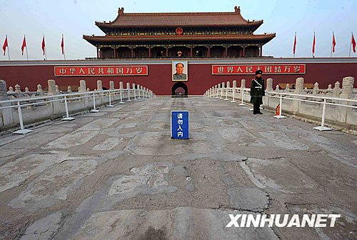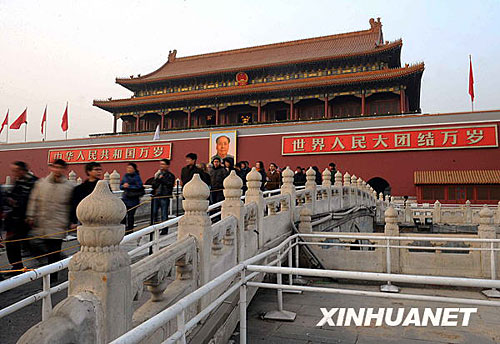 據(jù)北京市文物局9日透露,為迎接2009年國慶60周年,確保游客和文物安全,北京市文物局已于近日啟動了天安門金水橋加固修繕工程,整個工程預(yù)計將于2009年5月完工。天安門金水橋是整個天安門景觀的重要組成部分,因游客眾多以及風(fēng)化等自然因素,天安門金水橋橋面此前多處出現(xiàn)破損,欄桿部分也出現(xiàn)裂縫,存在一定的安全隱患。新華社記者羅曉光攝
