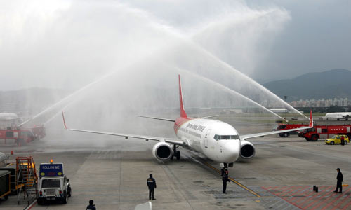 2008年12月15日,深圳航空首航臺(tái)灣的第一班平日包機(jī)在臺(tái)北松山機(jī)場(chǎng)降落。松山機(jī)場(chǎng)方面以噴水方式表示歡迎。兩岸常態(tài)包機(jī)直航從此開始營運(yùn)。(“中央社”圖)