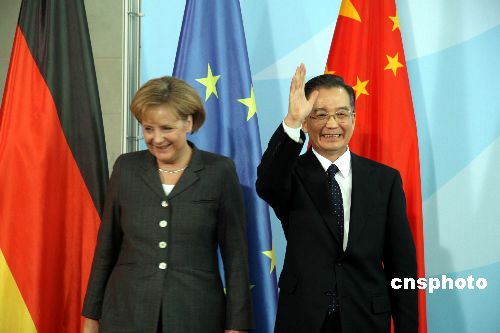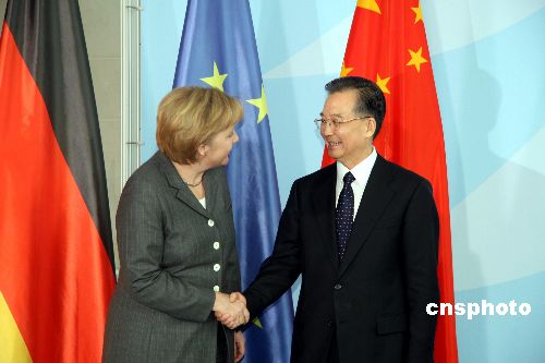 中國(guó)國(guó)務(wù)院總理溫家寶二十九日在柏林和德國(guó)總理默克爾進(jìn)行了會(huì)談,中德兩國(guó)簽署了共同努力穩(wěn)定世界經(jīng)濟(jì)形勢(shì)的聯(lián)合聲明和氣候、交通等合作項(xiàng)目文件。中新社發(fā) 吳衛(wèi)中 攝