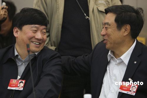 3月4日,全國(guó)政協(xié)十一屆二次會(huì)議進(jìn)行分組討論,審議政協(xié)全國(guó)委員會(huì)常務(wù)委員會(huì)工作報(bào)告和提案工作情況報(bào)告。圖為招商銀行行長(zhǎng)馬蔚華與浦發(fā)銀行董事長(zhǎng)吉曉輝交談。中新社發(fā) 盛佳鵬 攝