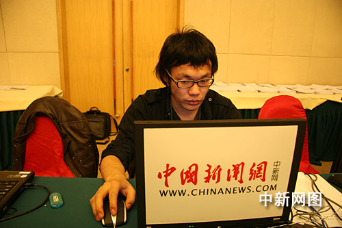 3月6日下午,出席十一屆全國人大二次會議的5位企業(yè)家代表在大會新聞中心(梅地亞中心多功能廳)就“企業(yè)如何應對國際金融危機的挑戰(zhàn)”接受中外記者的采訪。圖為本網(wǎng)記者在現(xiàn)場進行直播。中新網(wǎng)記者 唐偉杰 攝