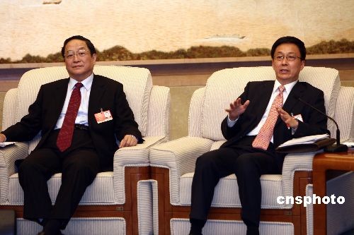 3月7日,全國(guó)人大上海代表團(tuán)在人民大會(huì)堂舉行全體會(huì)議。上海市委書(shū)記俞正聲(左)、市長(zhǎng)韓正出席會(huì)議。韓正在接受采訪時(shí)表示,已向國(guó)務(wù)院提交在上海成立人民幣結(jié)算試點(diǎn)申請(qǐng),希望能盡快推進(jìn)。中新社發(fā) 杜洋 攝