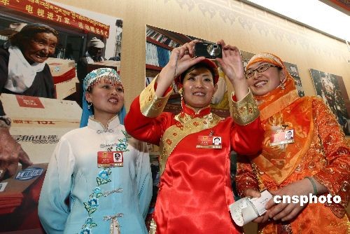 3月8日,參加全國人大的甘肅團代表參觀在北京民族宮舉辦的西藏民主改革50年大型展覽。保安族馬曉琴代表(左)、東鄉(xiāng)族馬含嵐代表(中)、回族畢紅珍代表在展覽現(xiàn)場用相機留下珍貴紀念。中新社發(fā) 杜洋 攝