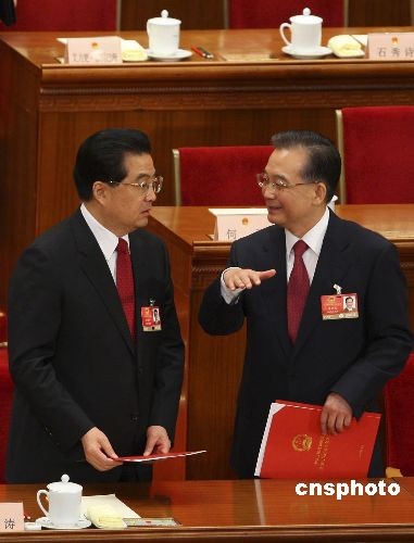 3月13日,第十一屆全國人民代表大會(huì)第二次會(huì)議在北京人民大會(huì)堂舉行閉幕會(huì),國家主席胡錦濤在會(huì)議閉幕后與國務(wù)院總理溫家寶交談。中新社發(fā) 盛佳鵬 攝