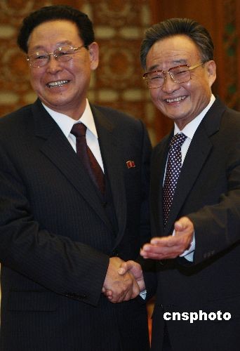 3月19日下午,中國全國人大常委會(huì)委員長吳邦國在北京人民大會(huì)堂會(huì)見朝鮮民主主義人民共和國內(nèi)閣總理金英日。中新社發(fā) 任晨鳴 攝