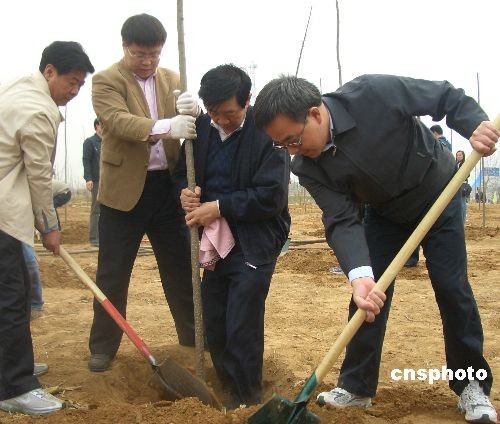 2009年3月21日,河北省及石家莊市黨政軍領(lǐng)導(dǎo)及省市四大辦公機關(guān)干部、部隊官兵1900人,在石家莊市鹿泉市山前大道韓莊生態(tài)林業(yè)基地,建設(shè)“省級領(lǐng)導(dǎo)紀念林”、“市級領(lǐng)導(dǎo)紀念林”、“駐石部隊紀念林”100多畝,栽植速生楊樹12000株,再一次掀起了省會造林綠化高潮。中新社發(fā) 俱凝搏 攝