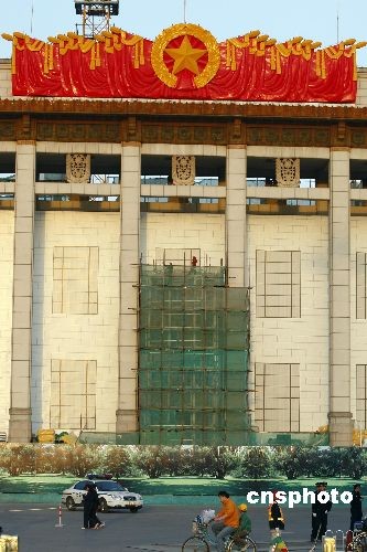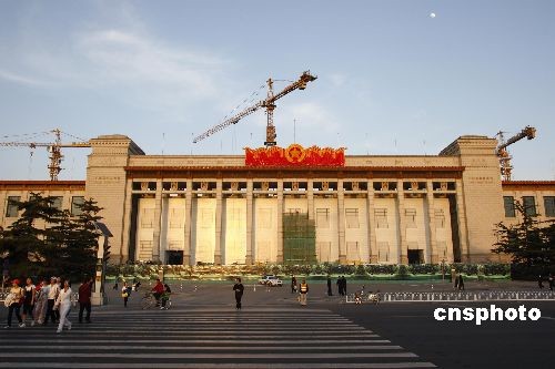4月6日,中國(guó)國(guó)家博物館西門前罩上了綠色圍擋,工作人員正在加緊搭建上海世博會(huì)倒計(jì)時(shí)牌。據(jù)悉,該倒計(jì)時(shí)牌將于2009年5月1日上海世博會(huì)倒計(jì)時(shí)一周年之際正式亮相。全國(guó)政協(xié)常委、上海世博會(huì)執(zhí)委會(huì)執(zhí)行主任萬(wàn)季飛在“兩會(huì)”期間表示,上海世博會(huì)將于明年5月1日開幕,在倒計(jì)時(shí)一周年之際,組委會(huì)將于今年5月1日在天安門廣場(chǎng)和國(guó)家博物館西門前豎立上海世博會(huì)倒計(jì)時(shí)牌,7月5日到15日將在首都博物館舉辦走進(jìn)世博會(huì)大型巡展。中新社發(fā) 鄭雄增 攝