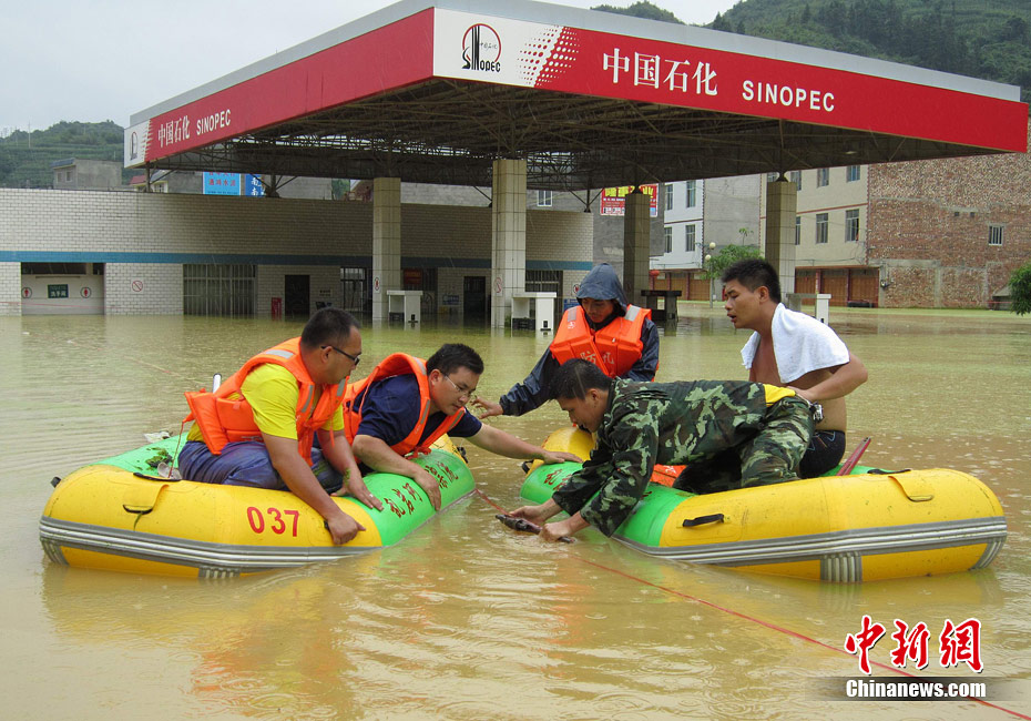 由于遭遇連日暴雨,廣西凌云縣邏樓鎮(zhèn)內(nèi)澇成災(zāi),全鎮(zhèn)一片汪洋,積水深達(dá)2米多高,民眾只能用小機(jī)船和自制排伐作為交通工具。由于該鎮(zhèn)所在地為一個(gè)小盤地,沒有排水的地方,估計(jì)一個(gè)月后積水才能自然排完。6月27日20時(shí)至29日,廣西凌云縣遭遇罕見強(qiáng)降雨襲擊,造成嚴(yán)重洪澇災(zāi)害。初步統(tǒng)計(jì),當(dāng)?shù)匾丫o急轉(zhuǎn)移一萬多人。圖為30日所攝邏樓鎮(zhèn)被淹景象。黃燕飛 攝
