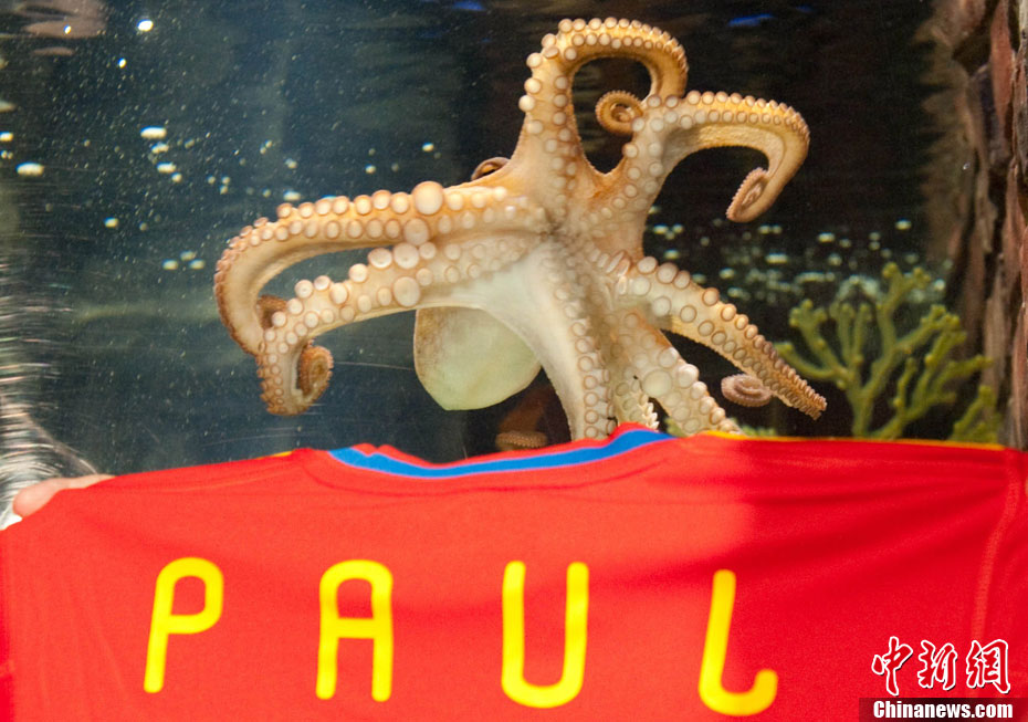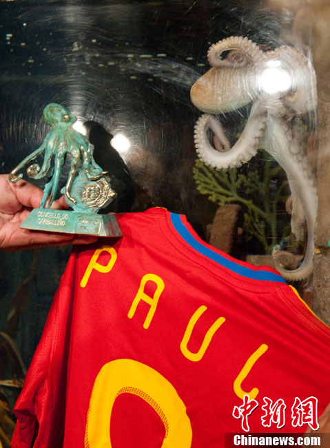 近日,曾在2010年南非世界杯上大放異彩的“章魚(yú)哥”保羅再獲殊榮。西班牙卡瓦利諾市市長(zhǎng)在德國(guó)奧博豪森水族館正式贈(zèng)送給保羅一件印有它名字的西班牙隊(duì)隊(duì)服和保羅自己的青銅像,稱保羅為“城市最好的朋友”。