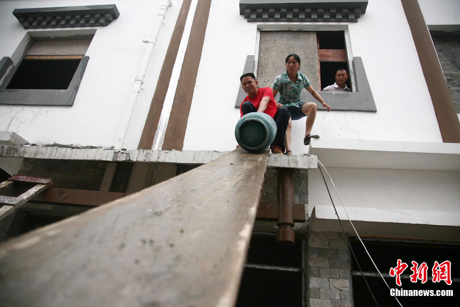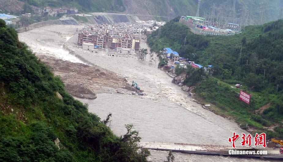 8月16日,發(fā)生泥石流災(zāi)害已經(jīng)兩天的四川省汶川縣映秀鎮(zhèn)新城,洪水水位略有下降,搶險(xiǎn)人員還正全力自處置堰塞體。圖為被洪水圍困的映秀新城。中新社發(fā) 張浪 攝