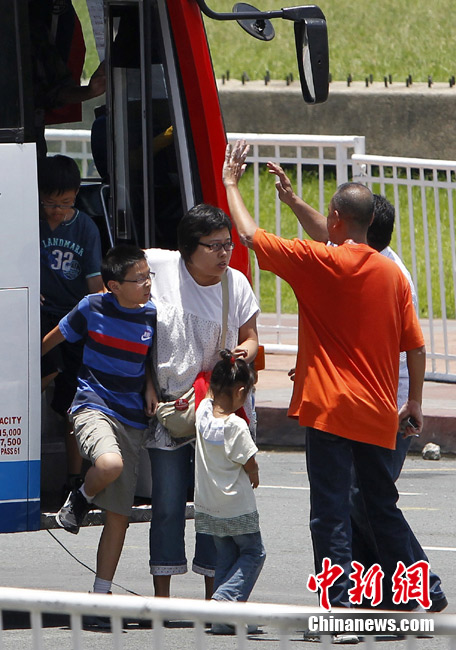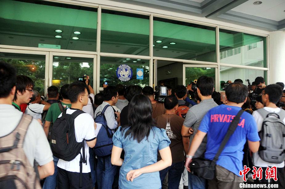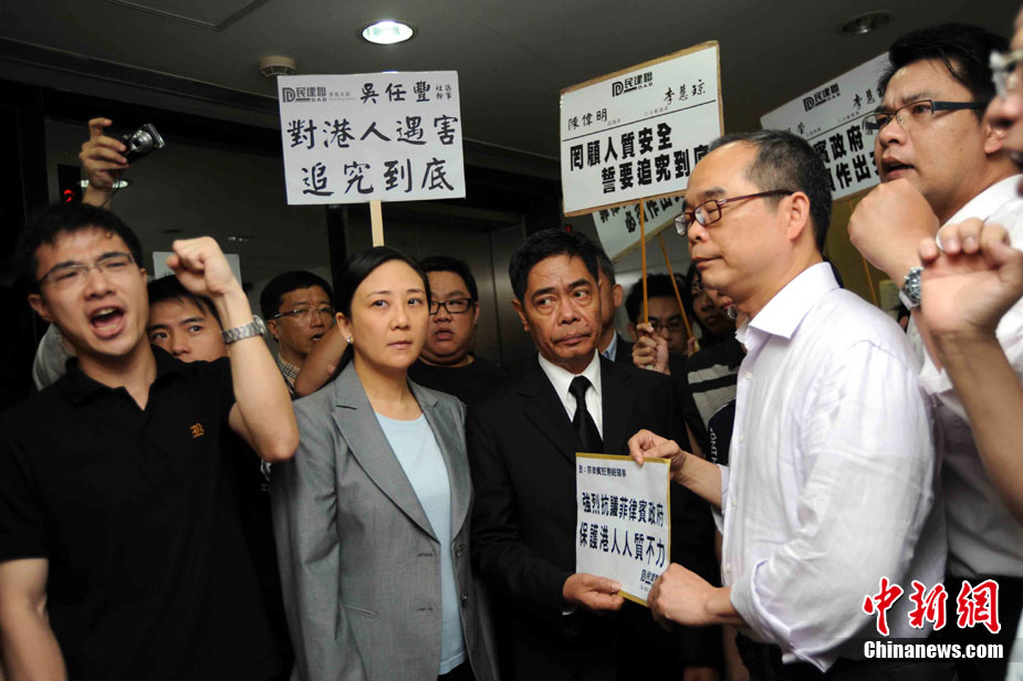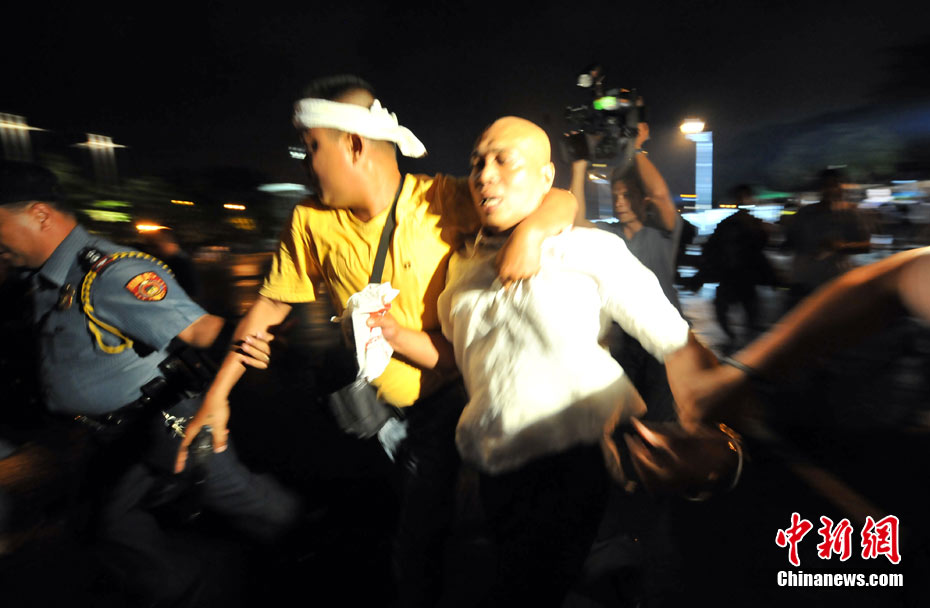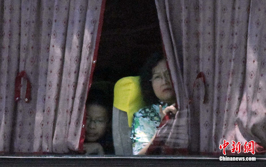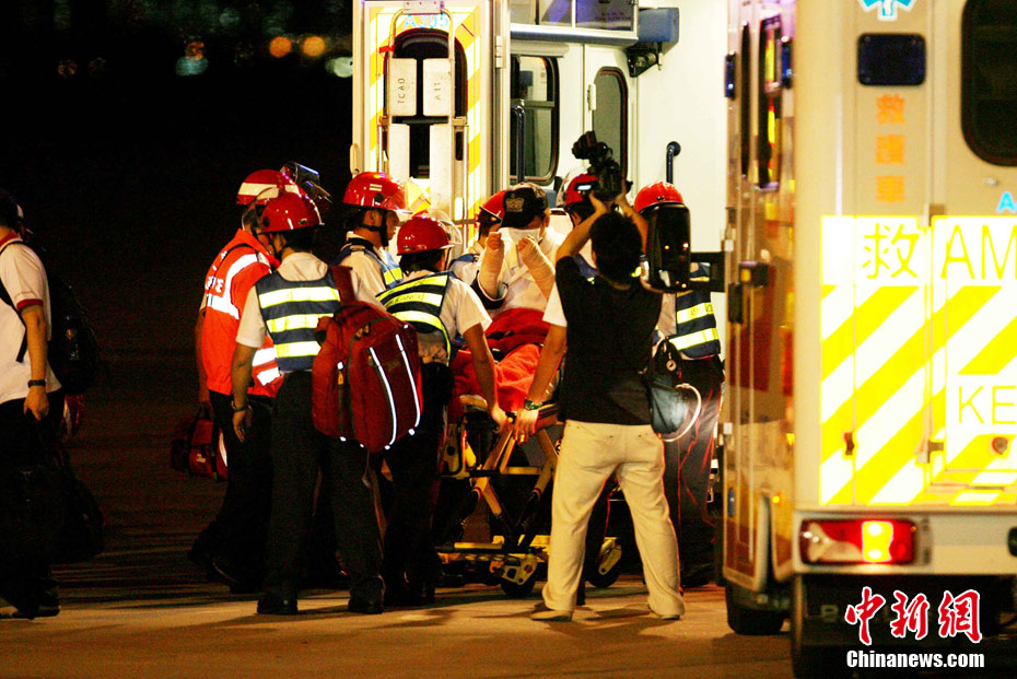 8月25日晚上,在菲律賓挾持人質(zhì)事件中傷亡的傷者和家屬及遇難者遺體乘香港政府包機(jī)返抵香港。特區(qū)政務(wù)司司長(zhǎng)唐英年、中聯(lián)辦副主任李剛、及多名特區(qū)官員上機(jī)慰問。停機(jī)坪又舉行了告別儀式,唐英年及家屬在風(fēng)笛聲中,將花圈蓋上靈柩。整個(gè)儀式歷時(shí)一個(gè)多小時(shí),靈柩隨即運(yùn)往葵涌公眾殮房。部份傷者送威爾斯醫(yī)院治理。中新社發(fā) 洪少葵 攝