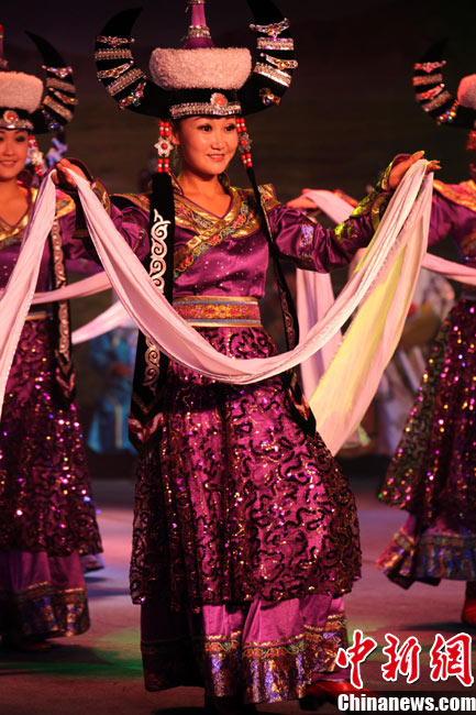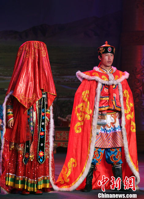 8月25日晚,參加“鄂爾多斯青銅器與早期東西方文化交流——北方草原通道”國際學(xué)術(shù)研討會的近百位中外考古學(xué)家,觀賞蒙古族傳統(tǒng)婚禮。圖為英國劍橋大學(xué)馬丁·瓊斯教授(右)、倫敦大學(xué)大衛(wèi)·哈里斯教授擔(dān)任婚禮主婚人,并應(yīng)邀掀開新娘子的紅蓋頭。中新社記者 孫自法 攝