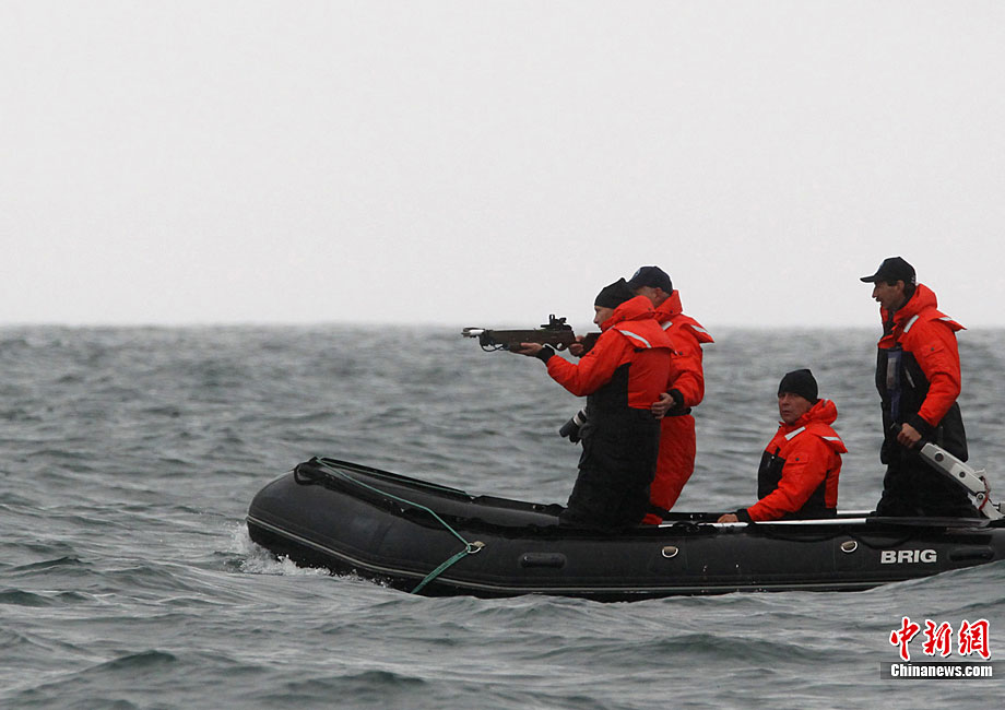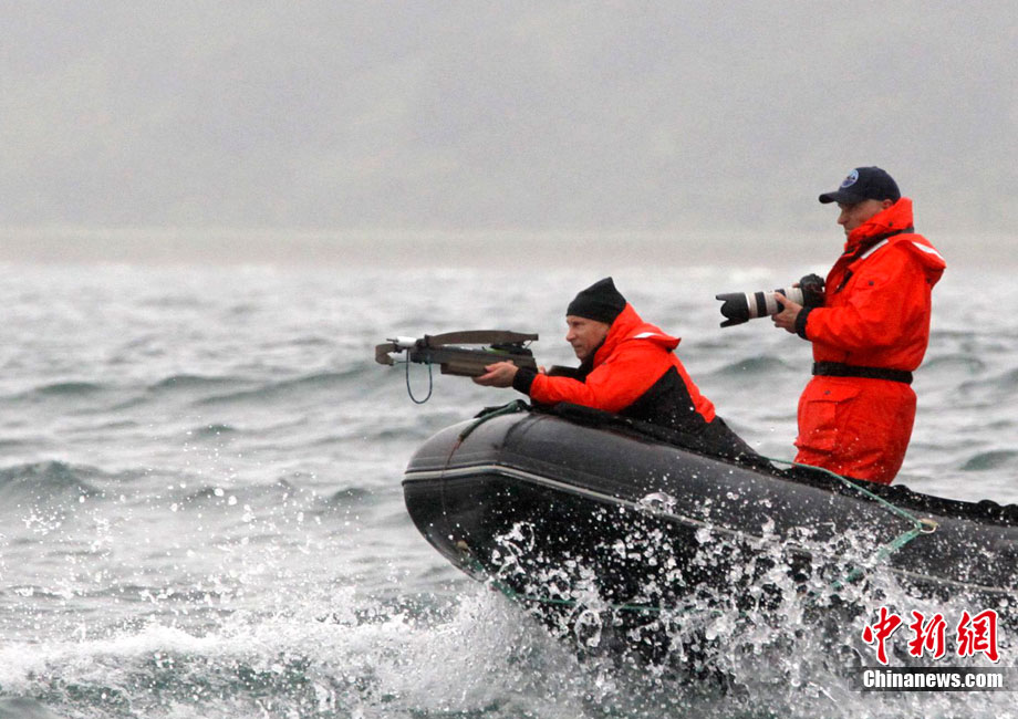當地時間8月25日,俄羅斯總理普京在勘察加半島附近的奧爾加港參與科學考察時,乘坐橡皮艇、手持勁弩,再次秀了一把射飛鏢獵捕灰鯨的風采。