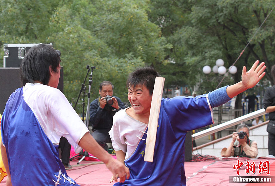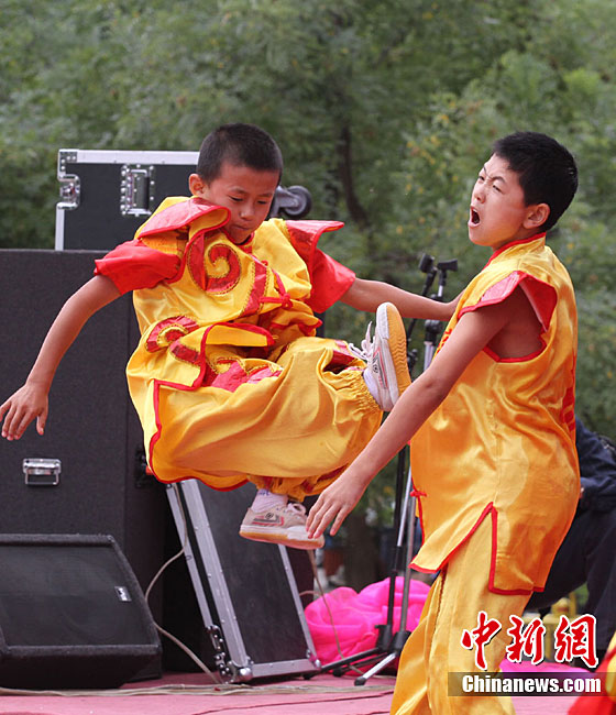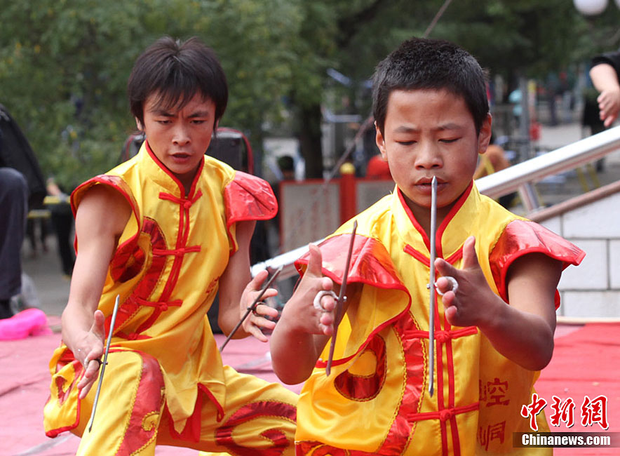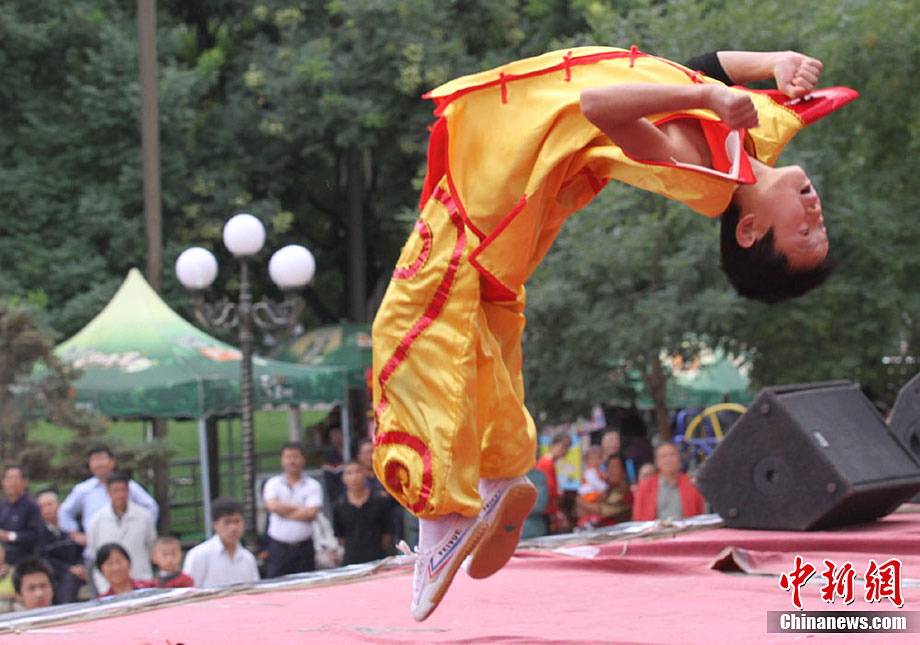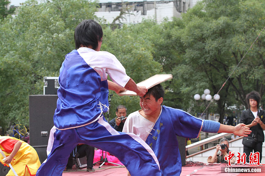 9月1日,蘭州東方紅廣場(chǎng)上演一場(chǎng)崆峒武術(shù)秀。崆峒派武術(shù)是與少林、武當(dāng)、峨嵋、昆侖齊名的五大武術(shù)流源之一,崆峒武術(shù)與道教文化緊密相連,神秘奇詭,風(fēng)格獨(dú)特。中新社記者 殷春永 攝