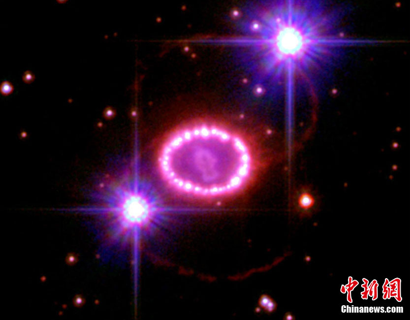 美國(guó)宇航局近日拍到一顆名為1987A的超新星爆發(fā)時(shí)形成的美麗“星膽”,而這場(chǎng)絢麗的爆發(fā)距離地球約16.3萬(wàn)光年!靶悄憽敝袊@著超新星爆發(fā)后留下的30到40個(gè)閃亮的殘余物,形成一個(gè)直徑約9.6萬(wàn)億公里的圓環(huán),酷似由一顆顆璀璨的珍珠串成的項(xiàng)鏈。