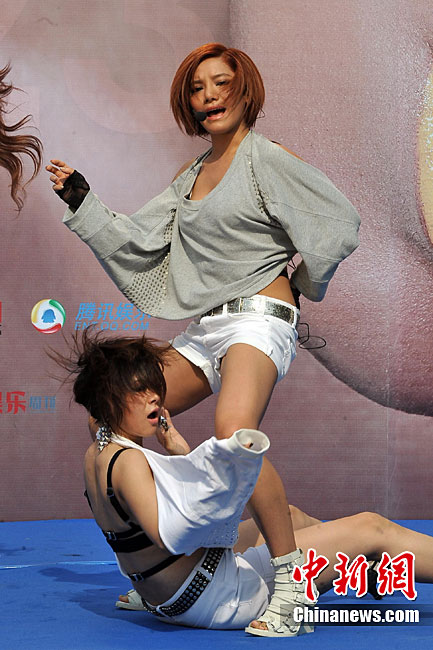 9月13日,09年快樂女聲冠軍VIVI江映蓉首張個(gè)人專輯《壞天使》全國媒體發(fā)布會(huì)在北京舉行。發(fā)布會(huì)上,置身于鐵籠子里的江映蓉由六名猛男抬上舞臺(tái),她所散發(fā)出的女王般的氣勢與危險(xiǎn)的性感氣息,抹殺了現(xiàn)場的大片菲林。江映蓉現(xiàn)場帶來了新專輯的主打歌《壞天使》,帶領(lǐng)眾舞者演繹火辣的她,跟隨節(jié)奏慢慢脫去身上的白色小外套,最后僅剩一件黑色十字比基尼在身,熱辣的舞蹈動(dòng)作讓現(xiàn)場溫度直線上升。中新社記者 李學(xué)仕 攝
