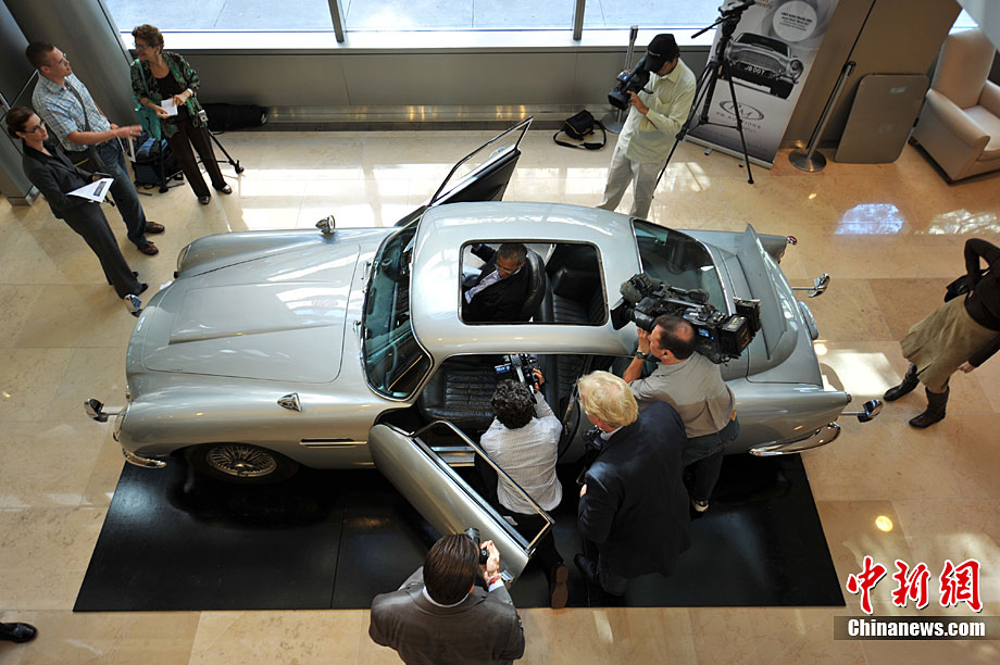 曾經(jīng)在“007”系列電影《金手指》和《雷霆萬(wàn)鈞》中作為主人公詹姆斯·邦德座駕的阿斯頓·馬丁DB5跑車將于2010年10月27日在英國(guó)倫敦巴特西公園(Battersea Evolution)拍賣。圖為這款轎車正在美國(guó)紐約蘇富比拍賣行展出。
