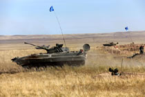 當(dāng)?shù)貢r間9月15日,“和平使命-2010”上海合作組織成員國武裝力量聯(lián)合反恐軍事演習(xí),按計劃在哈薩克斯坦馬特布拉克訓(xùn)練場成功進(jìn)行聯(lián)演戰(zhàn)役準(zhǔn)備階段的第二次合練——無彈藥消耗全員全裝實兵合練,旨在按演習(xí)科目和進(jìn)程,開展實兵現(xiàn)地推演。圖為參演坦克出動。中新社記者 孫自法 攝