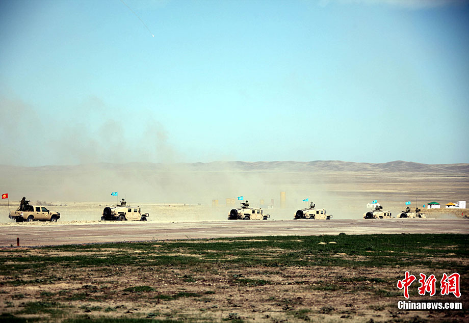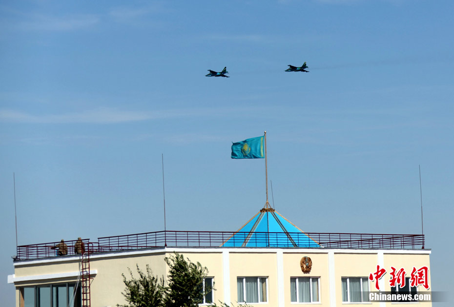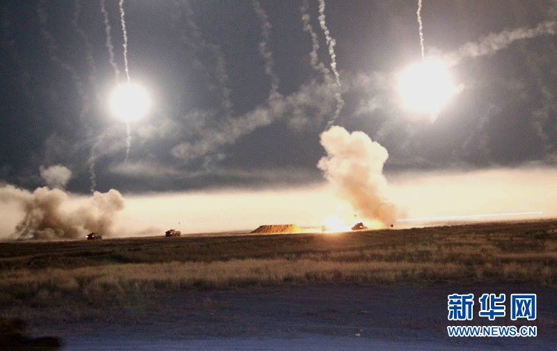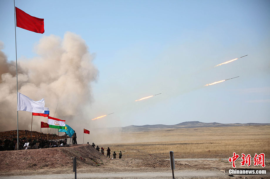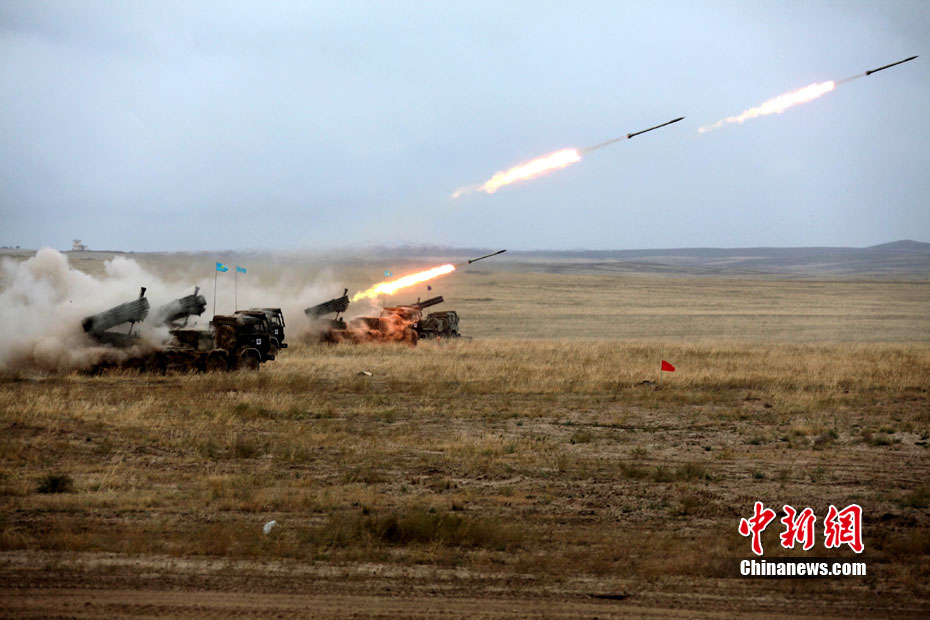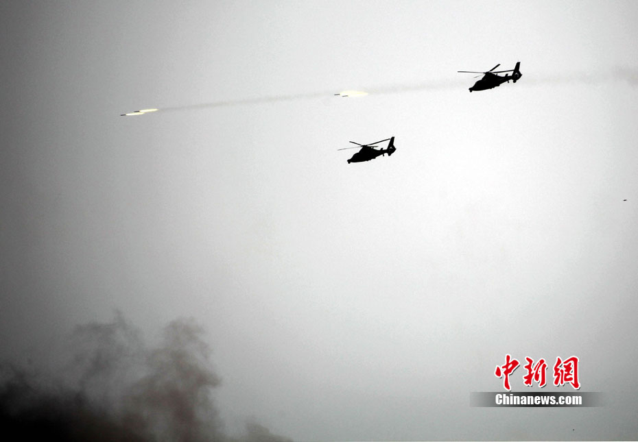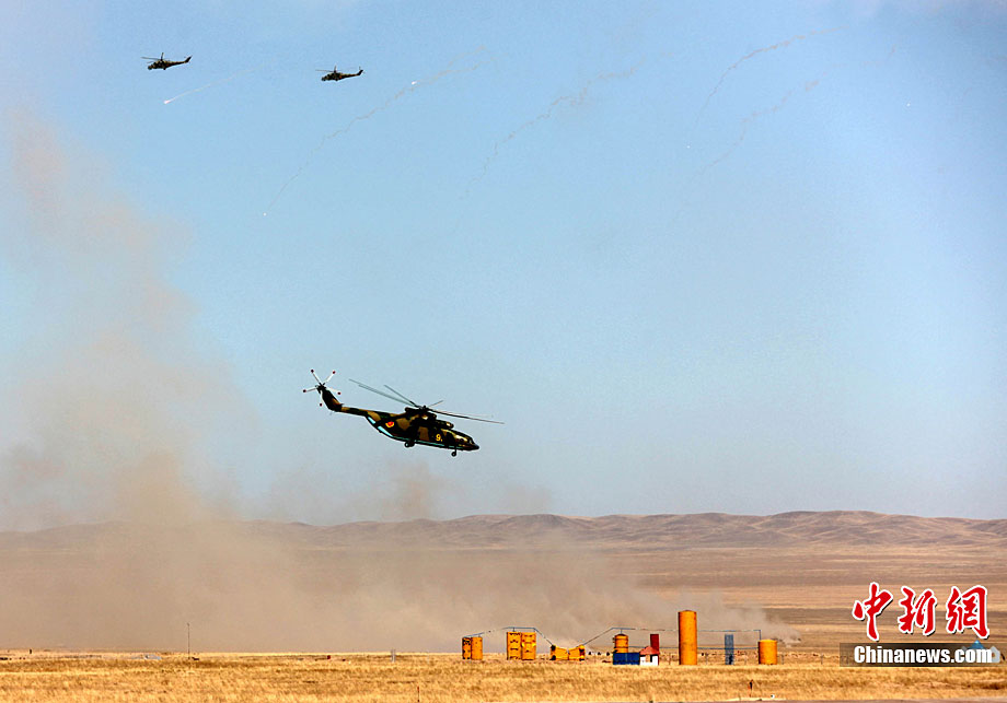 9月17日,“和平使命-2010”上海合作組織成員國武裝力量聯(lián)合反恐軍事演習,按計劃在哈薩克斯坦馬特布拉克訓練場成功進行首次實兵實彈合練,這也是本次聯(lián)演戰(zhàn)役準備階段的第三次合練。圖為參演直升機從演習地域上空輪番實施打擊。中新社發(fā) 孫自法 攝